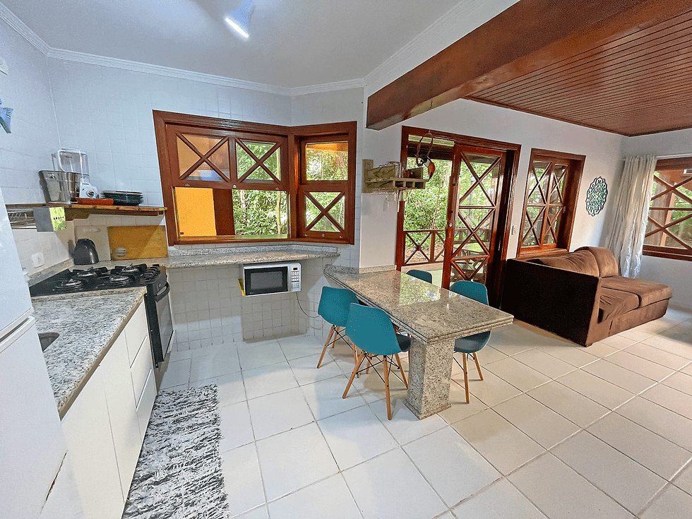 Hospede- se com conforto neste APARTAMENTO TÉRREO, composto por dois quartos sendo uma suíte, sala integrada à cozinha americana equipada, banheiro social completo e varanda com churrasqueira. Com localização privativa e próximo às piscinas, o imóvel oferece contato com a natureza exuberante da mata atlântica. Ideal para receber seis hóspedes com excelente comodidade, podendo acomodar até seis adultos e duas crianças menores de 12 anos.